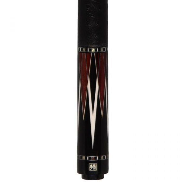 Choose from three expertly designed shaft options, each paired with a radial pin joint to offer the perfect balance and control. The Beserker’s stunning aesthetic is highlighted by its ebony wood forearm, adorned with 20 intricate points outlined in maple and veneers, creating a visual feast of sophistication and elegance. The sleek butt sleeve, crafted from ebony and grey-stained curly maple, complements the forearm’s design, making this cue a true work of art.